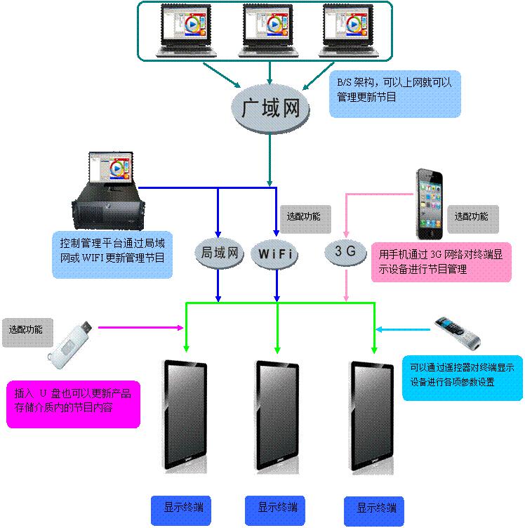支持局域網、廣域網等組網方式,終端可通過LAN、WIFI、WLAN、3G網絡鏈接入網,滿足有線無線聯網需求;無網絡時,將做好的節目通過U盤也能更新